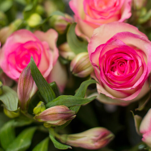 Edelrosen sind ein echter Blickfang und verleihen Ihrem Zuhause oder Ihrem Büro ein Hauch von Romantik. Diese Woche überraschen wir Sie mit einer Kombination aus rosafarbenen langstieligen Edelrosen und exotischen Inkalilien.