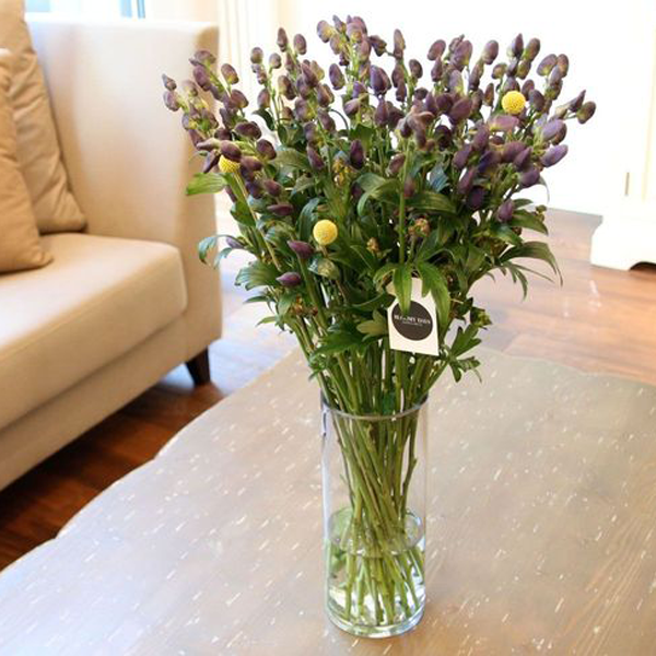 Der Eisenhut ist sehr durstig, also achten Sie bitte darauf, dass er immer genügend Wasser hat und die Blätter nicht darin stehen. Die Craspedia ist ein sehr anspruchsloser Mitbewohner. Sie kann als Trockenblume über einen langen Zeitraum mit vielen anderen Schnittblumen kombiniert oder allein bewundert werden.