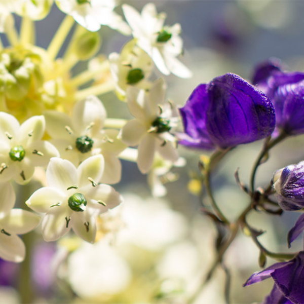 Schneiden Sie den Eisenhut und die Milchsterne bei Ihrer Ankunft frisch an und stellen Sie sie anschließend in frisches Wasser. Der Eisenhut ist sehr durstig. Achten Sie darauf, dass immer genügend Wasser in der Vase vorhanden ist.