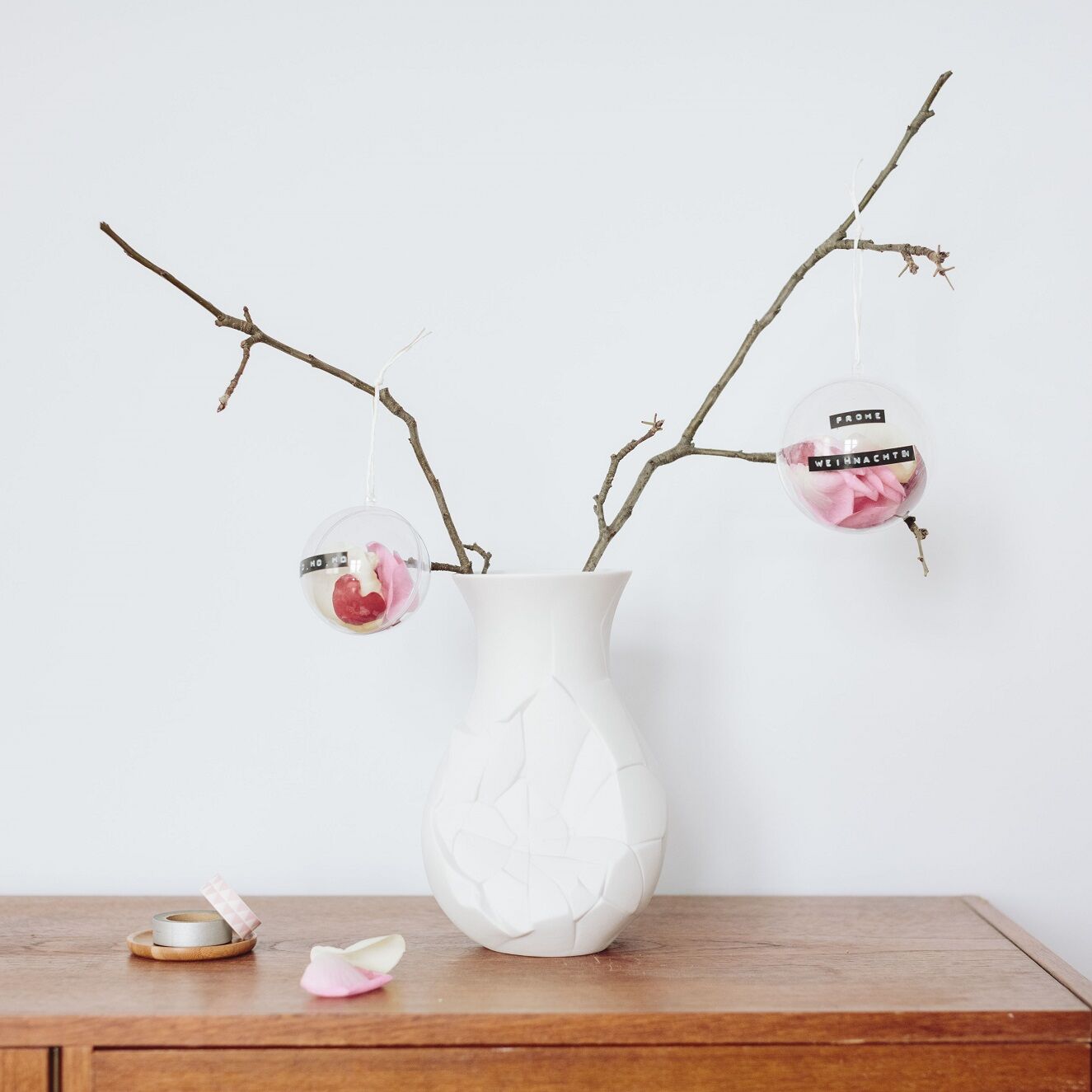 Diese edlen Weihnachtskugeln können Sie ganz klassisch am Weihnachtsbaum aufhängen oder stilvoll in einer Glasvase arrangieren. Wir haben uns dafür entschieden, die blumigen Christbaumkugeln an weihnachtlichen Zweigen zu hängen und in einer hübschen Vase anzurichten. Wie Sie Zuhause diese Weihnachtsdeko einsetzen, ist ganz Ihrer Kreativität überlassen!