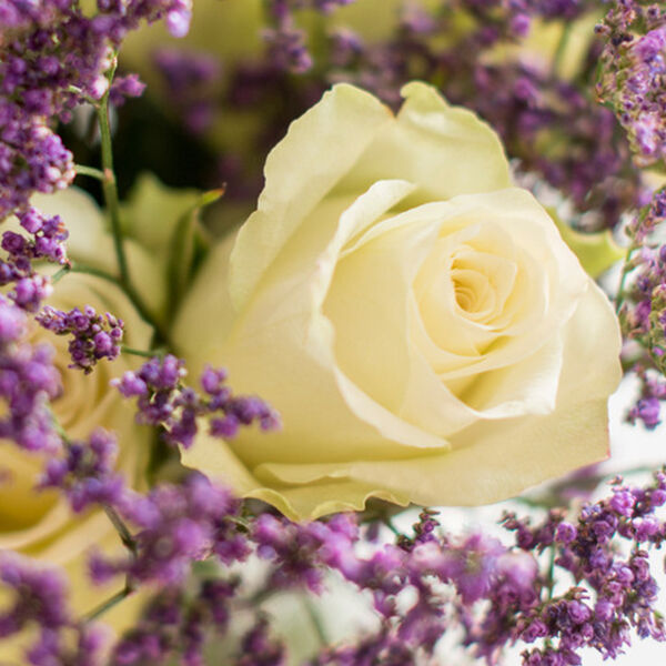 Ein Meer aus weißen Rosen und ein Farbklecks mitten drin, der es in sich hat. Wir senden Ihnen diese Woche schneeweiße Rosen umspielt von violetten Limonium.