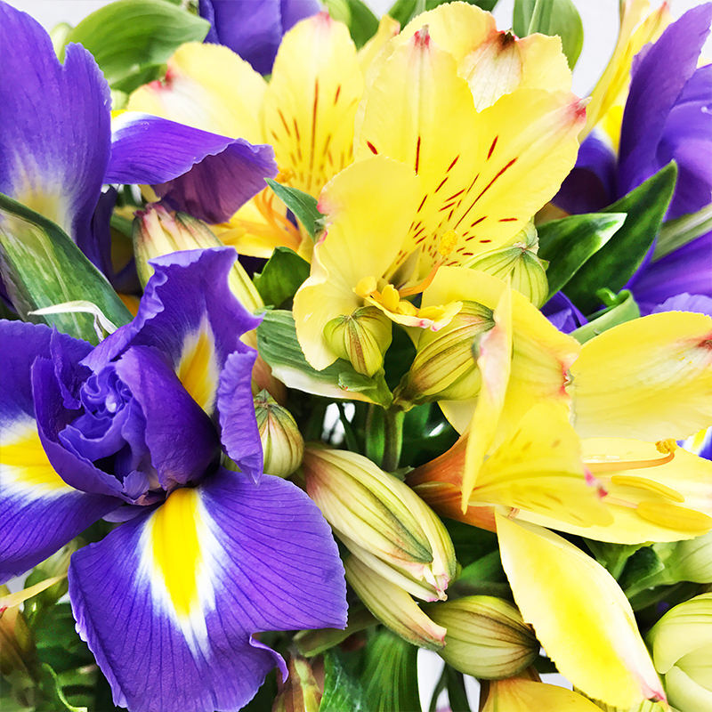 Die zarten Blüten der Inkalilie harmonieren perfekt mit den farbprächtigen Iris in „Capri Sunset“. Das satte grün der Inkalilienblätter bringt Frische in das Bouquet. Mit ihrer Leichtigkeit und exotischen Herkunft, bringt die Inkalilie gute Laune und Wärme ins Haus – perfekt für den Start in den Frühling. Weitere Informationen und Pflegetipps zu Inkalilien erhalten Sie hier.