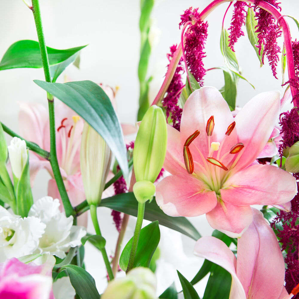 Für die langstielige Kombination „Catch The Fox“ empfehlen wir eine sehr hohe Vase, die sowohl die langen Stiele der Lilien und Gladiolen als auch den Fuchsschwanz gut zur Geltung kommen lässt.