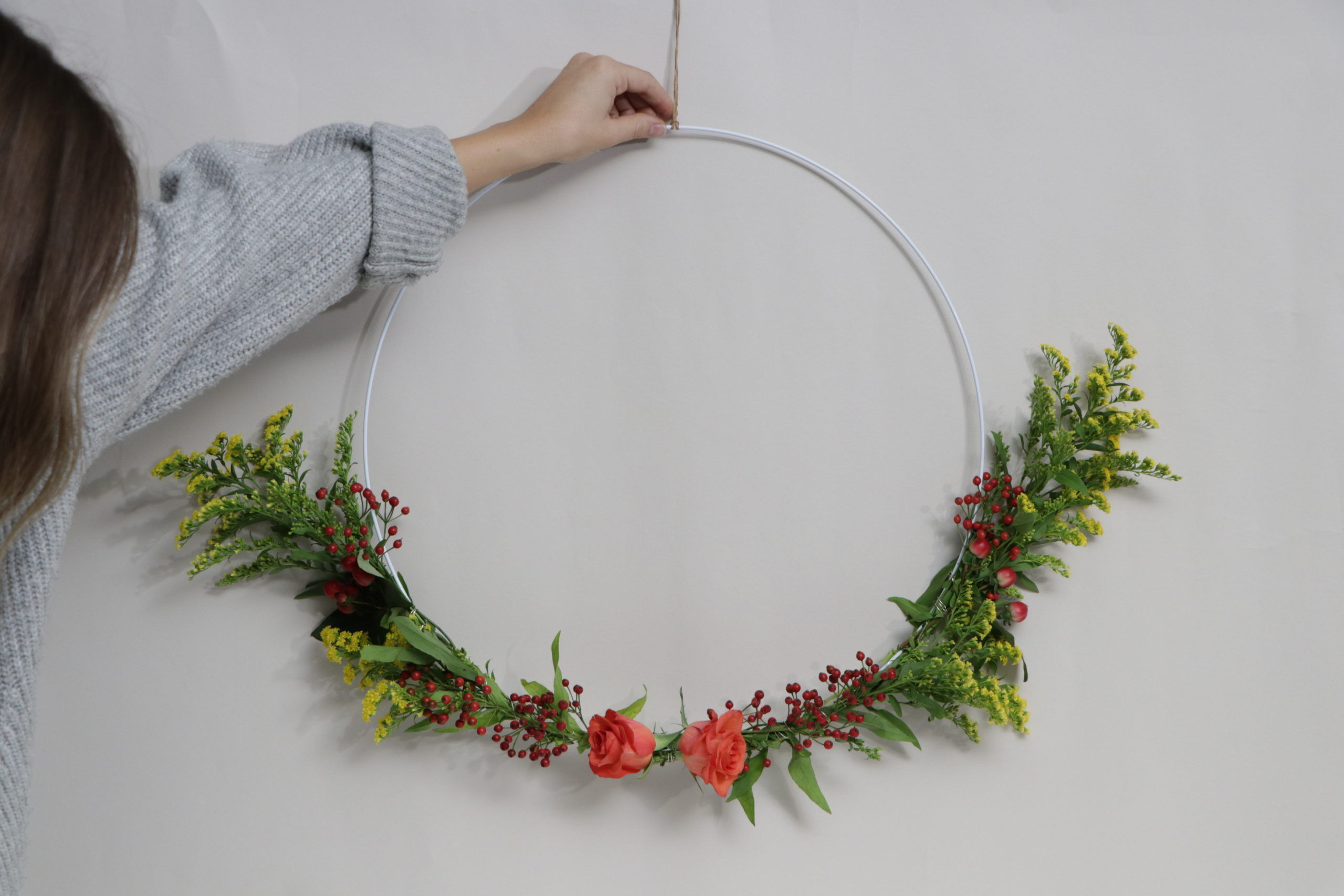 Im nächsten Schritt legt Ihr die Hagebutten und die Rosen an den Ring und umwickelt sie wieder mit dem Draht, sodass sie fest sitzen und auch nichts herunterfallen kann.