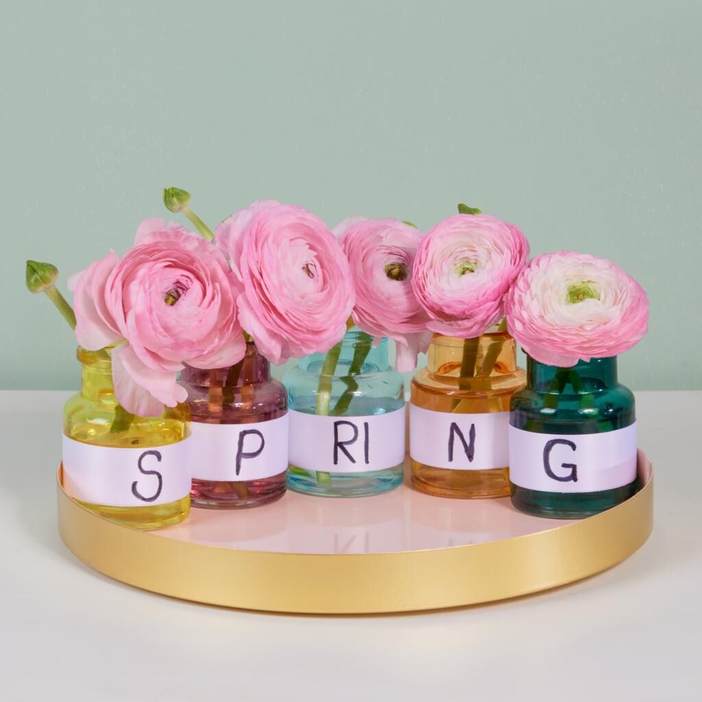 4. Im letzten Schritt schneidest Du die Ranunkeln auf die passende Länge zurecht und arrangierst sie in den fünf Vasen. Jetzt musst Du nur noch einen schönen Platz für diesen Hingucker finden und der Frühling kann kommen!