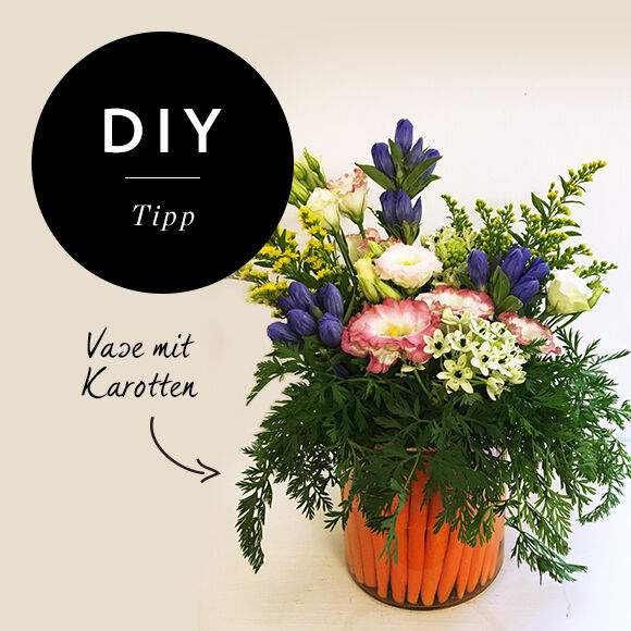 Fertig ist Ihre Karottenvase! Wir wünschen Ihnen viel Spaß beim Nachmachen! Gerne können Sie uns auch von Ihren Kreationen ein paar Bilder, zum Beispiel bei Facebook, schicken! Wir freuen uns darüber sehr!