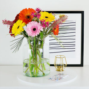 Für dieses Bouquet empfehlen wir eine Tischvase mit weiter Öffnung, damit die einzelnen Blüten gut zur Geltung kommen.