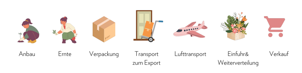 Auf den Blumenfarmen müssen die Fairtrade-Standards eingehalten werden. Darüber haben wir euch bereits in einem anderen Blogpost erzählt. Heute haben wir eine Übersicht über den üblichen Transportweg eurer Fairtrade-Blumen zusammengestellt, damit ihr einen direkten Einblick bekommt: