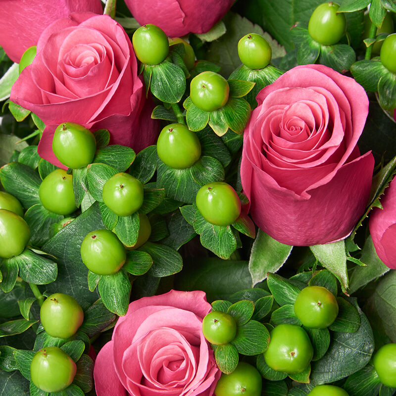Das langstielige Bouquet überzeugt diese Woche mit schlichter Eleganz, die zugleich Freude auf Sommer macht. „Fresh Harmony“ ist eine Zusammenstellung aus pinken Rosen und grünem Hypericum und kombiniert die wohl berühmteste und klassischste Blütenpflanze mit der anmutig verzweigten Schnittblume.