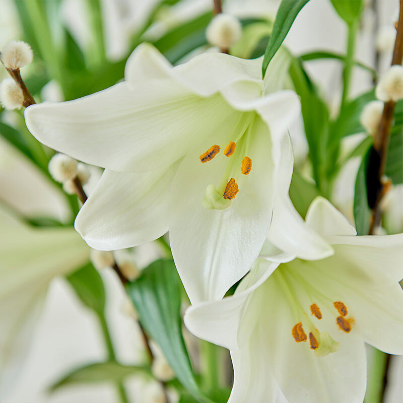 Für dieses Bouquet empfehlen wir eine recht lange Vase mit hohem Hals, die den Lilien guten Halt gibt. Schneiden Sie die Lilien alle zwei Tage schräg an. Die Weidenkätzchen können Sie auch als Trockenblume in eine Vase ohne Wasser stellen.