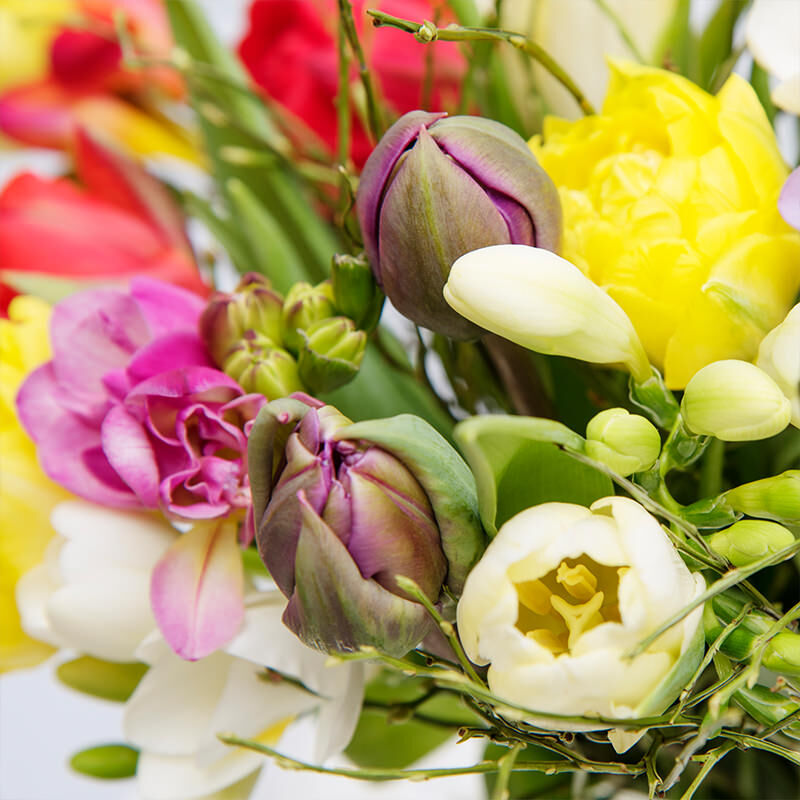Wie ein warmer Frühlingsnachmittag im Garten bei Sonnenschein und leckeren eisgekühlten Getränken – Garden Freesia verzaubert uns mit strahlenden Farben und dem süßen Duft von Freesien. Diese wunderbare Zusammenstellung aus bunten Tulpen, anmutigen Freesien und verspielter Heidelbeere zaubert gute Laune und bringt unbeschwerte Freude in Ihr Zuhause.