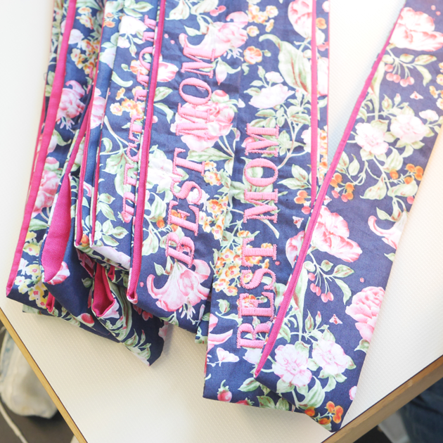 Das Schlüsselband wurde aus floralem Stoff gefertigt und trägt ebenso den Schriftzug „BEST MOM“ in pinkfarbenen gestickten Lettern. Gefertigt wurden diese in den Berliner Werkstätten für Menschen mit Behinderung (BWB).