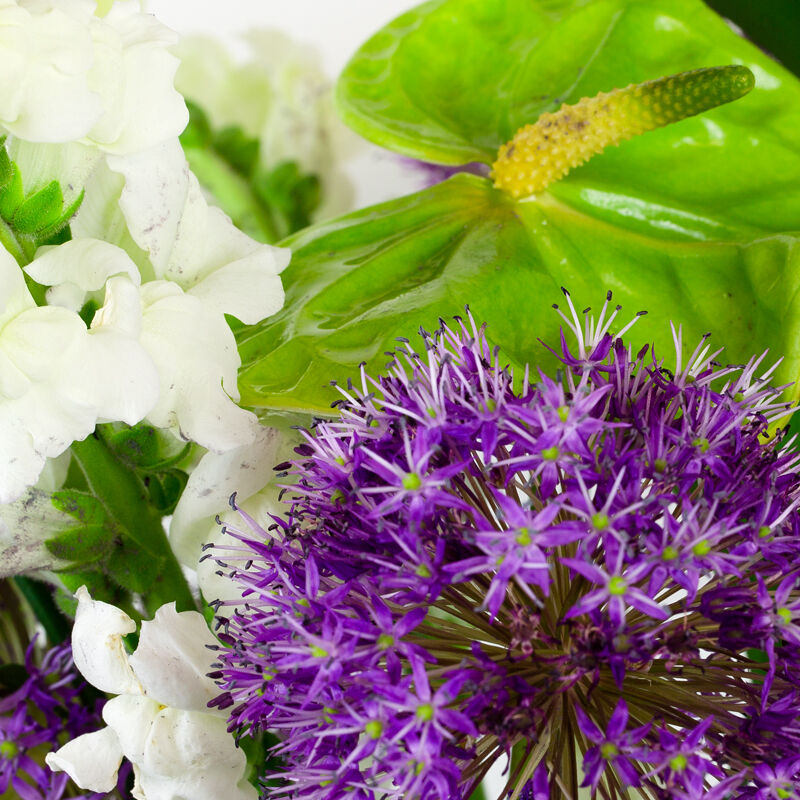 Allium, umgangssprachlich auch Zierlauch genannt, spielt eine große Rolle im volkstümlichen Aberglauben. Seit Jahrhunderten wird die Pflanze schon eingesetzt um Unheil, Krankheiten oder Hexen zu vertreiben. Dieses ist vor allem ihrer Zugehörigkeit zu den Zwiebelgewächsen zu verdanken. Durch den ungewöhnlichen Blütenstand ist der Zierlauch eine ganz besondere Überraschung innerhalb der Zwiebelfamilie. Die spektakuläre Kugel aus multiplen kleinen Einzelblüten beeindruckt mit seinem intensiven Lila in jeden Strauß. Wie die Anthurie zeichnet sie sich durch eine hervorragende Haltbarkeit aus und macht sich auch als Trockenblume sehr gut. Um einen zwiebelartigen Geruch zu vermeiden, empfiehlt es sich, die Stiele direkt nach dem Anschneiden ins Wasser zu stellen.