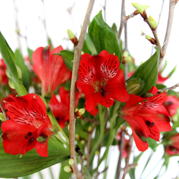 Die Alstroemerien, auch als Inkalilien bekannt, fallen durch ihre besondere Form auf. Sie sind eine Gattung in der Familie der Inkaliliengewächse (Alstroemeriaceae) innerhalb der Ordnung der Lilienartigen (Liliales), gehören also zu den Einkeimblättrigen Pflanzen (Liliopsida). Die länglichen Blätter drehen sich am Stiel entlang und am Ende teilt sich der Stiel in mehrere kleine Blütenstiele mit Blüten in wunderschön intensiven Farben und interessanten Zeichnungen. Diese außergewöhnliche Blüte allein macht schon aus dem Bouquet der Woche etwas ganz Besonderes. Es gibt etwa 40 bis 65 verschiedene Arten.