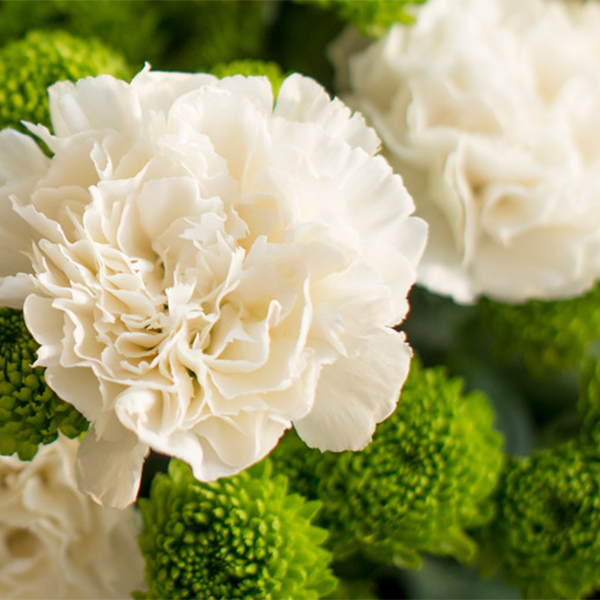 Nelken zählen neben Rosen und Tulpen heute in Deutschland zu den beliebtesten Schnittblumen und lassen sich hervorragend mit anderen Blumen kombinieren. Wir kombinieren die schneeweißen Nelken diese Woche mit grünen Santini.