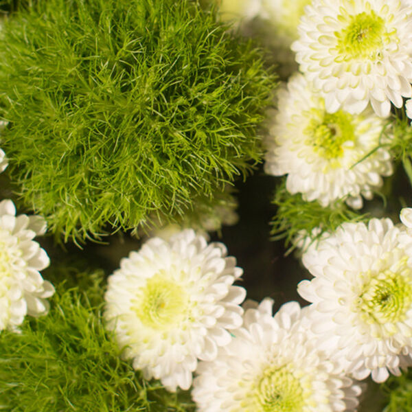 Begleitet werden die Green Trick Nelken von charmanten Korbblütlern, den Santini. Sie sind eine Art der Chrysanthemen und stammen ursprünglich aus China. Im 17. Jahrhundert fanden sie Ihren Weg über Japan nach Europa. Die frischen, fröhlichen Blüten der Santini, die zu den kaiserlichen, traditionellen Blumen aus Fernost zählen, strahlen einen ganz besonderen Reiz aus und machen sie zu einer beliebten Blume Europas.