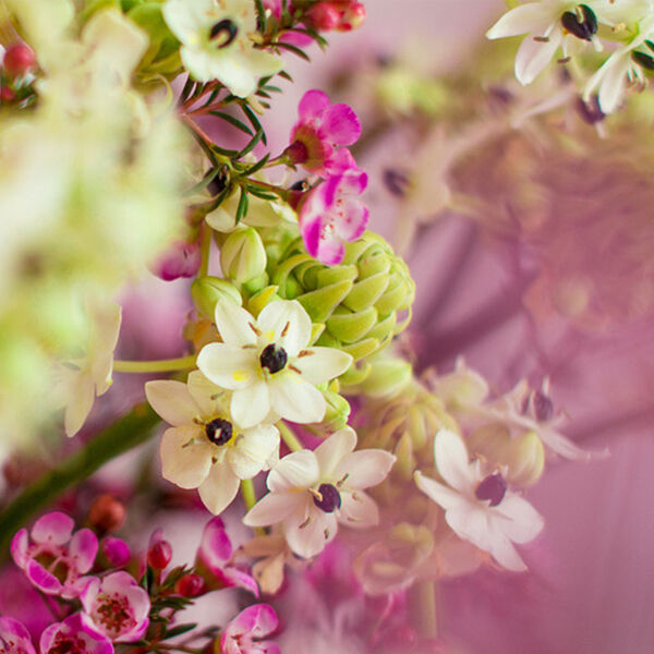 Die langen, zarten Stiele des Milchstern werden diese Woche von Waxflower umspielt. Die Waxflower, auch Wachsblume oder Hakiges Chamelaucium genannt, hat ihren Ursprung in Australien. Sie hat kleine rosa, weiß oder zart violett blühende Blüten mit feinen, nadelähnlichen Blättern. Die kleinen Blüten erscheinen im Spätwinter und Frühling. Ihr Name “Waxflower“ bezieht sich auf die bei genauer Betrachtung im Innern wachsartig überzogenen Blütenblätter.