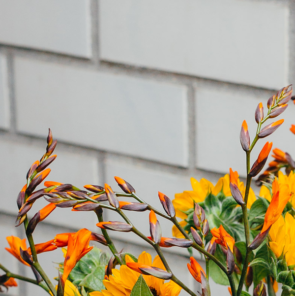 Das natürliche Verbreitungsgebiet, der nur etwa zwölf Arten der Montbretie, auch als Crocosmia bekannt, ist ausschließlich südlich der Sahara, vor allem in Südafrika. Seit dem 19. Jahrhundert wird sie jedoch kultiviert und ist deshalb auch in nördlicheren Gegenden nicht unbekannt. Sie ist ein beliebtes Staudengewächs in Gärten und Parks, da alle Sorten auffallend kräftige Farben haben, von gelb über orange bis knallrot, und jedes Beet zum strahlen bringen. Die Montbretie ist ein Schwertliliengewächs, weshalb die Blätter denen der Gladiole ähneln. Sie erreicht eine Wuchshöhe von 50-80 cm. Die trichterförmigen Einzelblüten sind in gebogenen, zweizeiligen Ähren angeordnet. Jeder Stiel bildet, neben einer große Ähre, mehrere kleine „Nebenähren“ aus. In der Vase entsteht durch diese unterschiedlich großen und hohen Blüten ein vielschichtiges Blütendurcheinander (im positivsten Sinne!). Bei näherem Hinsehen fällt einem jedoch sofort die Symmetrie jeder einzelnen Ähre auf. Es ist dieses „geordnete Chaos“, kombiniert mit dem feurigen orangerot, das jeden Betrachter in seinen Bann zieht.