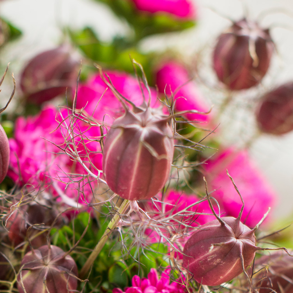 Schneiden Sie die Sommerastern und Nigella-Kapseln mit einer Blumenschere bei ihrer Ankunft frisch an. Entfernen Sie eventuell Blätter die sich noch am Stielende befinden, da diese, wenn sie in Kontakt mit dem Vasenwasser kommen, die Wasserqualität beeinträchtigen. Wechseln Sie das Wasser jeden zweiten Tag verbunden mit einem frischen Anschnitt.
