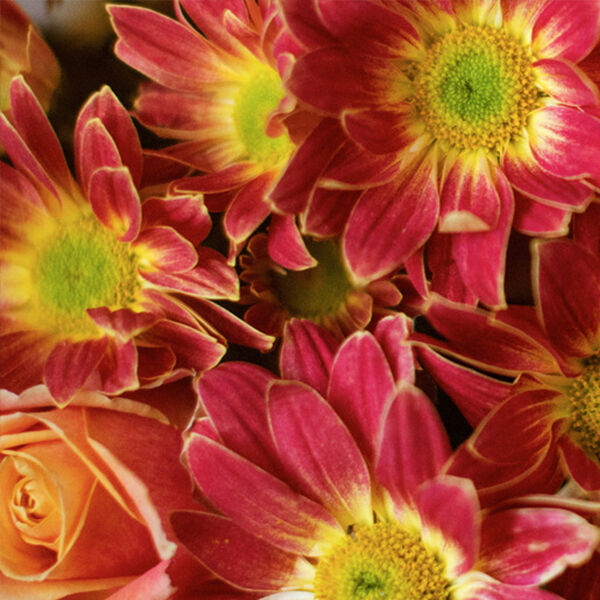 Haben Sie keine Berührungsängste bei den Rosen, denn wir haben die Dornen sorgfältig entfernt. Schneiden Sie die Rosen nur mit einem scharfen Messer schräg an. Somit erleichtern Sie ihr die Wasseraufnahme und verlängern ihre Haltbarkeit. Die Chrysanthemen freuen sich über einen schrägen Anschnitt. Wechseln Sie bitte das Wasser alle zwei Tage, da es sonst etwas anfängt zu riechen. Mit jedem Wasserwechsel sollten die Stiele erneut gekürzt und die einzeln verblühten Blüten der Chrysanthemen abgeknipst werden. Dadurch kann sich die Blume mit ganzer Kraft auf die übrigen Blüten konzentrieren.