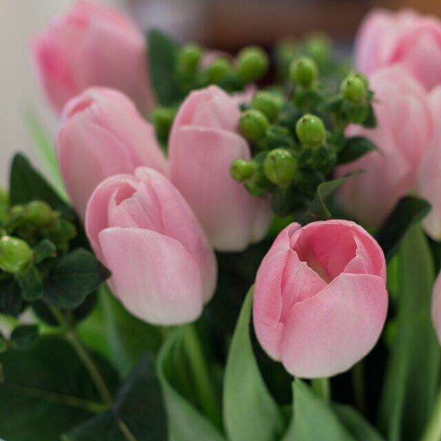 Diese Woche bringen farbenfrohe Tulpen in Kombination mit Hypericum Sonne in Ihre Tischvase! Diese kurzstielige Kombination erhalten Sie bei uns bis zum 21.03.2016.