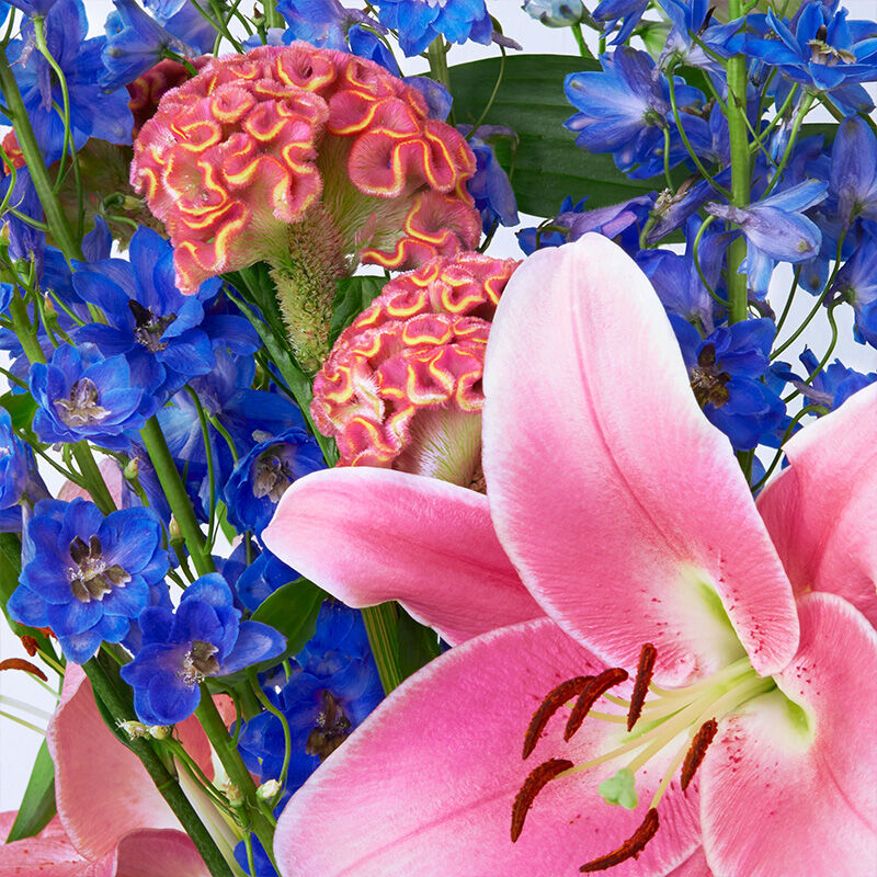 Mit dieser exotischen Kombination bringt unser langstieliges Bouquet der Woche die Schönheit ferner Länder und zugleich heimische Vertrautheit in jeden Raum. „Pure Bliss“ ist eine aufregende Zusammenstellung von blauem Delphinium, rosafarbenen Lilien, und pinken Celosia. Die außergewöhnliche Farbkombination dieses Bouquets ist wie gemacht für die warme und lebendige Jahreszeit und verleiht Ihrem Zuhause einen sommerlichen Flair.