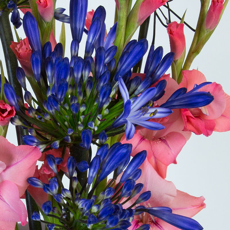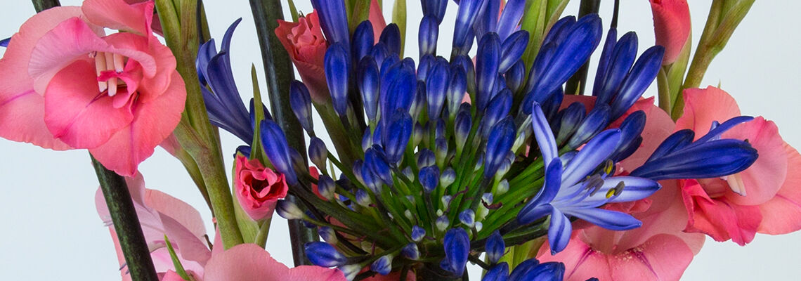Die Agapanthus, oder auch Schmucklilie genannt, kommt ursprünglich aus Südafrika und fand im späten 17. Jahrhundert ihren Weg nach Europa. Dort angekommen, konnte man sie, aufgrund ihrer Seltenheit, lange Zeit nur in luxuriösen Gärten finden. Die ungewöhnliche Lilienart, die wörtlich übersetzt „Liebesblume“ heißt, präsentiert sich meist in blassblau bis dunkelviolettem Farbton. Besonders auffällig ist ihr kugelförmiger Kopf: Jede der kleinen, farbigen Blüten sitzt auf einem fünf bis acht Zentimeter langen Stiel, die sternförmig aus dem Blütenstamm abgehen. Mit einer Gesamthöhe von bis zu einem Meter ist die Agapanthus außerdem auffällig groß und auch aufgrund ihrer Frostresistenz und dem dichten Blattwerk ein beliebtes Gartengewächs. In der Vase gedeiht die Schmucklilie besonders gut an einem sonnigen bis halbschattigen Plätzchen und besticht durch ihre besondere Form.