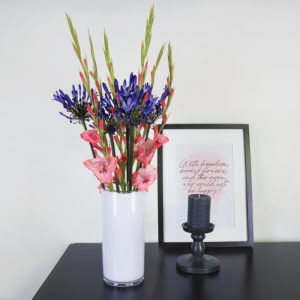 Die Gladiole ist ein beliebtes Element in sommerlichen Blumensträußen, da ihr Farbspektrum besonders vielfältig ist und es die einzelnen Blüten sogar mehrfarbig gibt! Zusammen ergeben die Schmucklilie und die Gladiole in dieser Woche eine sehr harmonische Einheit, die wundervoll duftend einmal mehr den Sommer herbeizaubert und dabei einen kleinen Farbakzent in die eigenen vier Wände zaubert!