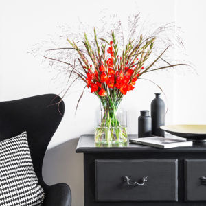 Wunderbar elegante Gladiolen kommen diese Woche mit „Red Blush“ als Mini Variante zu Ihnen in die Tischvase. Die hochgewachsenen Blumen werden dabei begleitet von rotem Panicum, das wie ein leichtes Rouge das Bouquet unterstützt und zu einem besonderen Blickfang macht.