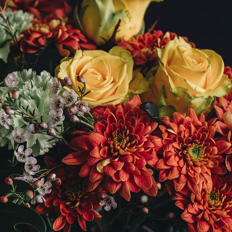 Die Chrysantheme mit ihren dunkel orangen Blüten passt perfekt zu den gelben Rosen. Chrysanthemen sind typische Herbstblumen und bleiben bei guter Pflege besonders lange frisch.