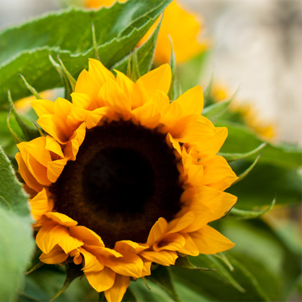 Wir haben die unteren Blätter der Sonnenblumen schon für Sie entfernt. Sollten doch noch einige mit dem Wasser in Ihrer Vase in Kontakt kommen, entfernen Sie diese, da sich sonst die Wasserqualität verschlechtert. Schneiden Sie die Stiele mit einem scharfen Messer schräg an. Anschließend können Sie zusätzlich einen von unten etwa 1 bis 2 Zentimeter tiefen Einschnitt machen, damit die Blume den Sauerstoff aus dem Wasser besser aufnehmen kann. Erhitzen Sie Wasser und halten Sie die Enden einige Sekunden in das kochende Wasser. Das verödet die Pflanzenfasern am Stiel, wodurch sich die Blumen nicht mit zu viel Wasser vollsaugen und die Stiele nicht anfangen zu faulen. Zum Schluss arrangieren Sie die Sonnenblumen in eine Vase mit lauwarmen Wasser und geben das Blumenfrisch mit hinein. Viel Freude!