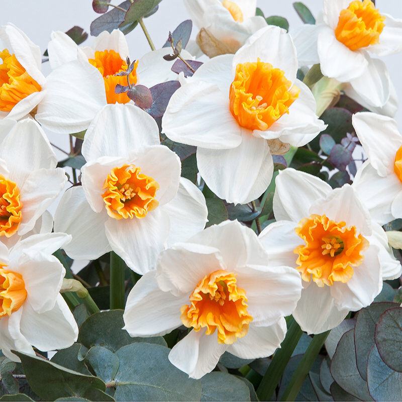 Für diese Kombination empfehlen wir eine niedrigere Tischvase mit etwas schmalerer Öffnung, die den Narzissen den nötigen Halt geben kann. Bitte beachten Sie unsere Empfehlungen zu dem Anschnitt der Narzissen, bevor Sie diese mit dem Eukalyptus zusammen in eine Vase stellen.