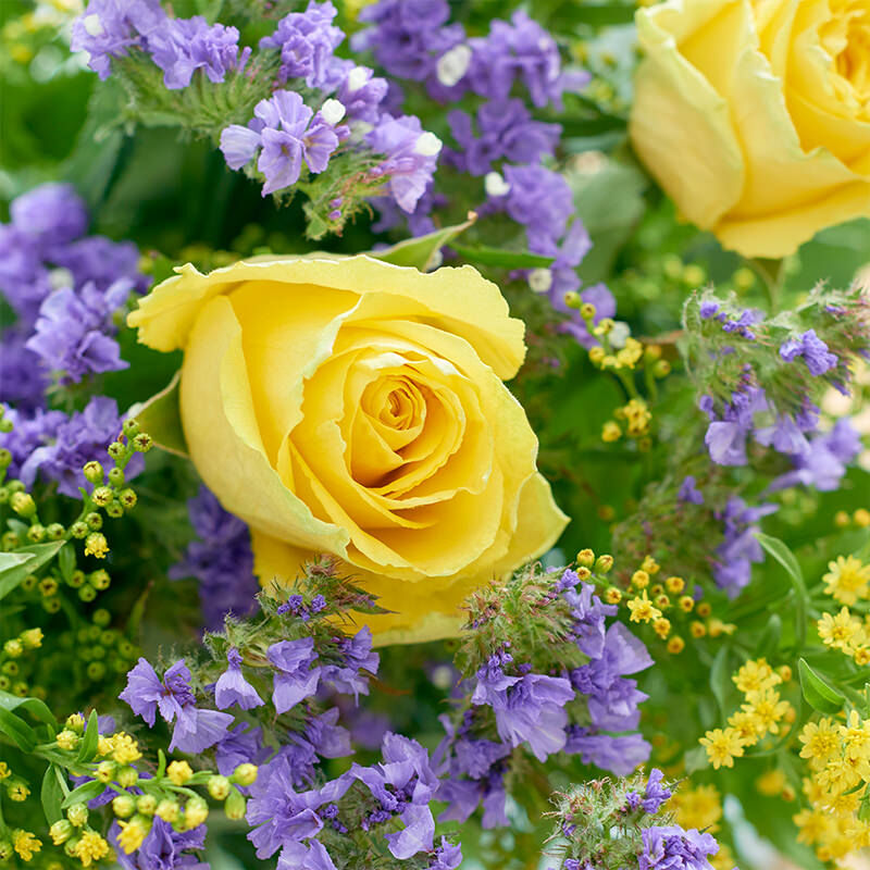 Diese Woche haben wir für Sie als langstieliges Bouquet eine farbenfrohe Kombination aus gelben Rosen, lilafarbene Staticie und Solidago kreiert.