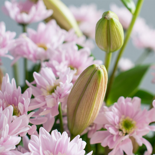 Wir können einfach nie genug von Lilien haben! Besonders die wunderschönen Brindisi Lilien verzaubern uns jedes mal auf’s neue mit ihrer majestätischen Ausstrahlung. Brindisi bezeichnet eine rosafarbene Liliensorte, die aufgeblüht ein wahrer Augenzauber ist. Wir kombinieren die klassische Eleganz der Brindisi Lilien mit verspielten Chrysanthemen.
