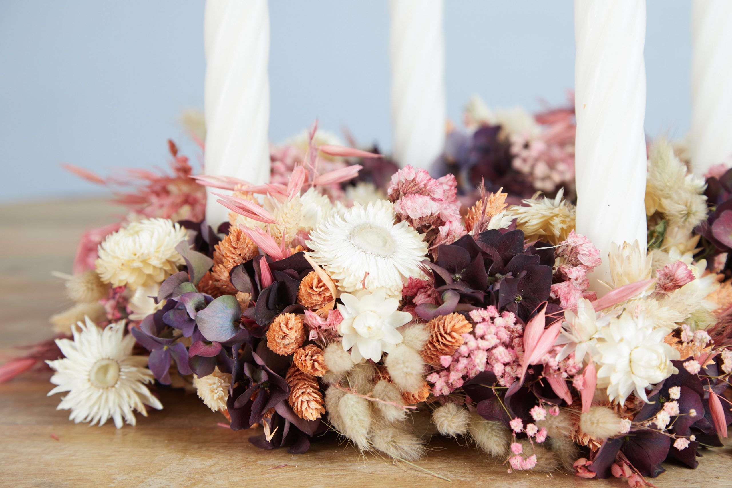 Für Trockenblumen-Adventskränze kannst Du quasi jede Sorte Trockenblumen oder Gräser verwenden. Besonders schön sind zum Beispiel Schleierkraut, Strohblumen, Strandflieder und Gräser wie Glanz- und Samtgras. Ebenfalls kannst Du einige frische Blumen wie z. B. Hortensien oder Disteln verarbeiten. Diese trocknen mit der Zeit langsam vor sich hin und verändern dabei sogar ihre Farbe, ein schöner Nebeneffekt.