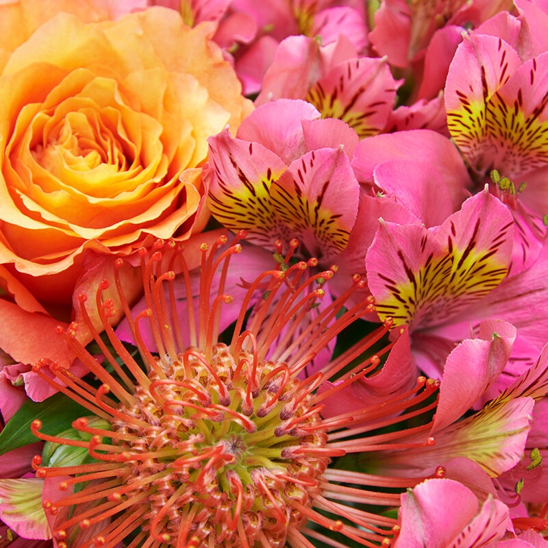 Zarte Inkalilien sind der perfekte Begleiter für die exotischen Nadelkissen und farbenfrohen Rosen in diesem Bouquet. Wir liefern Ihnen diese Blumen knosprig, damit Sie von Tag zu Tag zuschauen können, wie sich diese wunderbaren Blumen entwickeln.