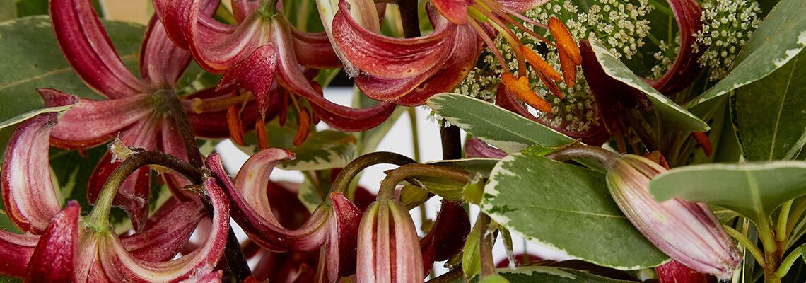 Eher selten in Sträußen anzutreffen – und gerade deswegen in dieser Woche bei uns – ist die zarte Martagon-Lilie, die auch unter dem Namen Türkenbund-Lilie bekannt ist. Die eher untypische Lilienart hat auffällige Blüten, die aus der Ferne an winzige Turbane erinnern und verzaubert mit einem violett bis braun-rotem Farbton und dunklen Farbsprenkeln. Ihre Namensherkunft ist leicht zu erraten: „Martagon“ leitet sich aus dem türkischen „martagan“ ab, was eine neuartige Form eines Turbans bezeichnet und Rückschlüsse auf ihre besondere Blütenform gibt.