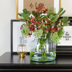Für dieses Bouquet empfehlen wir eine hohe Tischvase mit eher weiter Öffnung, um den Blumen den nötigen Freiraum zur Entfaltung zu geben.
