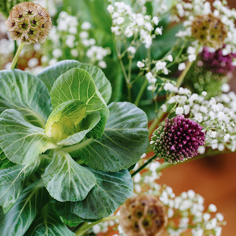 Zum Zierkohl gesellt sich in dieser Woche der ebenso anmutige Zierlauch. Mit seiner satten lila Farbe bildet das Gewächs einen schönen Kontrast zum weißen Zierkohl. Der Lauch ist vielseitig einsetzbar: Einige Arten sind bekannte Speise- und Würzpflanzen, andere Arten werden als Zierpflanzen genutzt. In unserem Bouquet der BLOOMEN der Woche sind die üppigen, lila Blütenkugeln ein echter Hingucker.