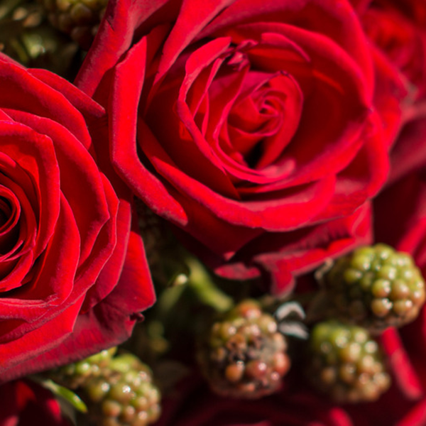 Wild und romantisch zugleich sind unsere BLUMEN DER WOCHE. Wir bezaubern Sie diese Woche mit tiefroten Rosen und Brombeeren. Brombeeren fragen Sie sich? Genau, diese gibt es nämlich nicht nur als leckere Frucht sondern auch als Schnittblumen. Diese sind allerdings nicht zum Verzehr gedacht, erfreuen Sie sich deshalb bitte nur an ihrem Anblick.