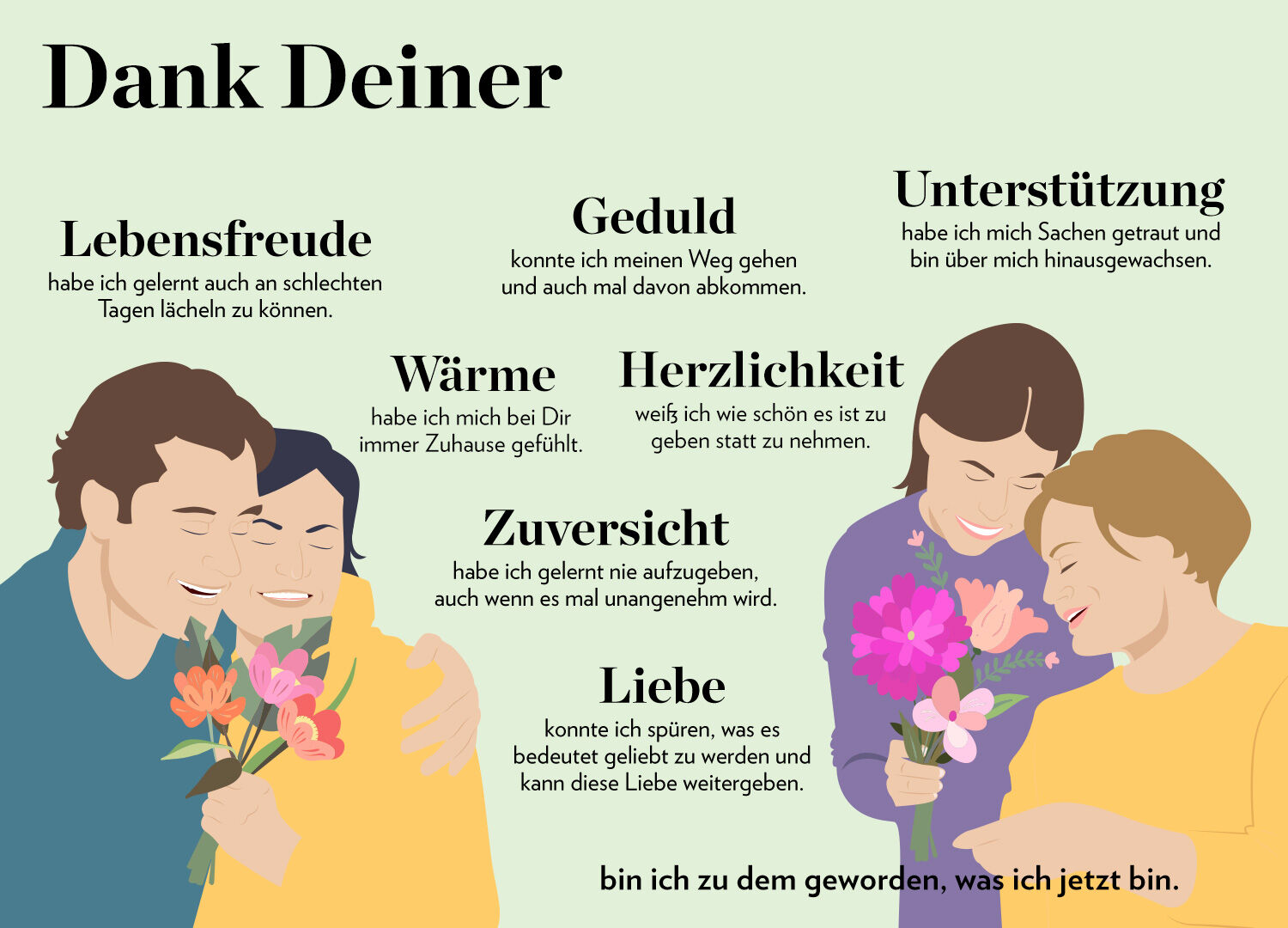 Bestimmt fallen sowohl Dir als auch uns noch weitere Begriffe ein, für die man seiner Mutter dankbar sein kann und schnell wird einem bewusst, dass man diese Dankbarkeit niemals ganz zum Ausdruck bringen können wird. Das ist aber auch nicht schlimm, denn mit Sicherheit war vieles davon selbstverständlich und ein Teil davon, eine Person aufzuziehen. Heute ist uns allen vieles bewusst was wir unserer Mama zu verdanken haben, wie sie uns mit ihrer Art geprägt hat und welche Eigenschaften wir von ihr übernommen haben. Der Muttertag ist ein guter Anlass sich dessen bewusst zu machen und vorallem: Um einfach Danke zu sagen.